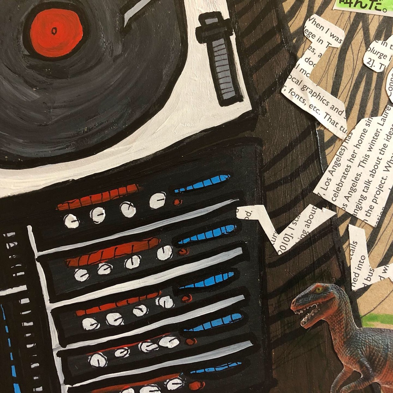 木の板にアクリル、マーカー、ペンを使用した絵にコラージュしたオリジナルのアート作品です